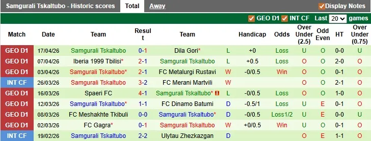Thống kê phong độ 10 trận đấu gần nhất của Samgurali Tskaltubo