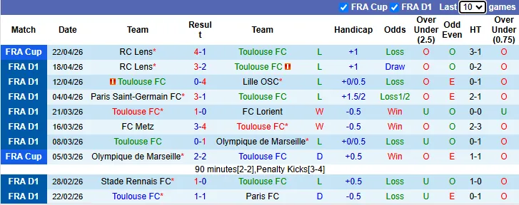Thống kê phong độ 10 trận gần nhất của Toulouse
