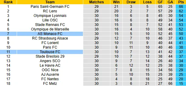 Phía đối diện, sau 7 chiến thắng liên tiếp, Monaco bất ngờ vấp ngã khi chỉ giành được vỏn vẹn 1 điểm trong 2 vòng đấu gần nhất. Cú sảy chân này khiến đoàn quân của HLV Sebastien Pocognoli rơi xuống vị trí thứ 7, kém nhóm dự Europa League 2 điểm và cách nhóm dự Champions League 4 điểm. Để cứu vãn mùa giải, đội bóng công quốc buộc phải thắng tất cả 4 trận còn lại.