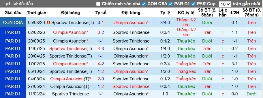 Sàn giao dịch châu Á ghi nhận mức kèo Olimpia Asuncion chấp 1/2 trái, tỷ lệ mà họ không quá lấn lướt khi đối đầu Trinidense, khi thắng 2 và hòa 2 về chuyên môn (thắng kèo 2, thua kèo 2). Tuy nhiên, ở thời điểm hiện tại màn thể hiện của Olimpia Asuncion là rất bùng nổ với 8/9 trận thắng kèo châu Á nên khả năng họ đủ sức để khiến đội chủ nhà ôm hận.