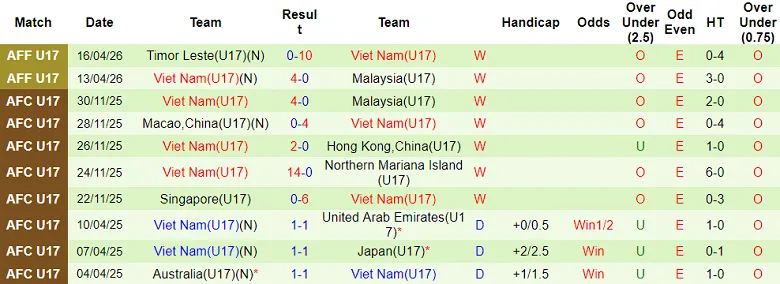 – Thống kê kết quả 10 trận gần nhất của U17 Việt Nam