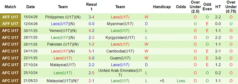 – Thống kê kết quả 10 trận gần nhất của U17 Lào