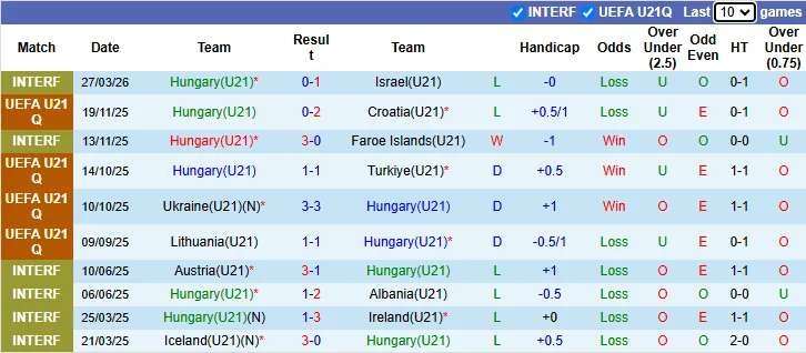 Thống kê phong độ 10 trận gần nhất của U21 Hungary