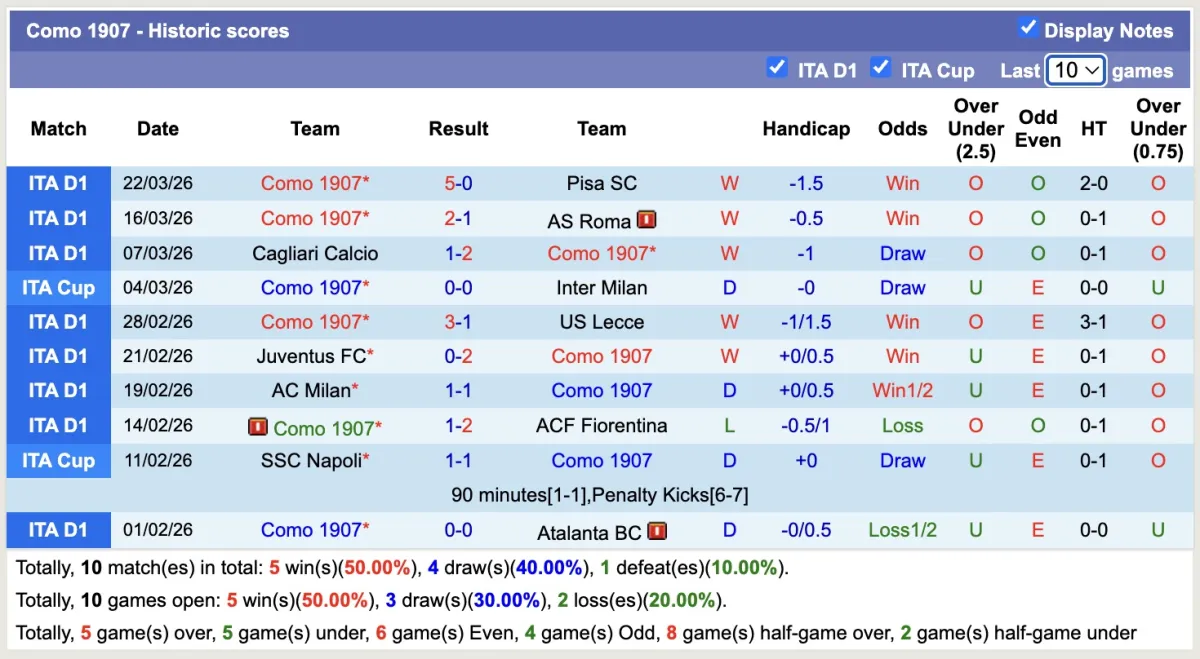 -Thống kê phong độ 10 trận đấu gần nhất của Como