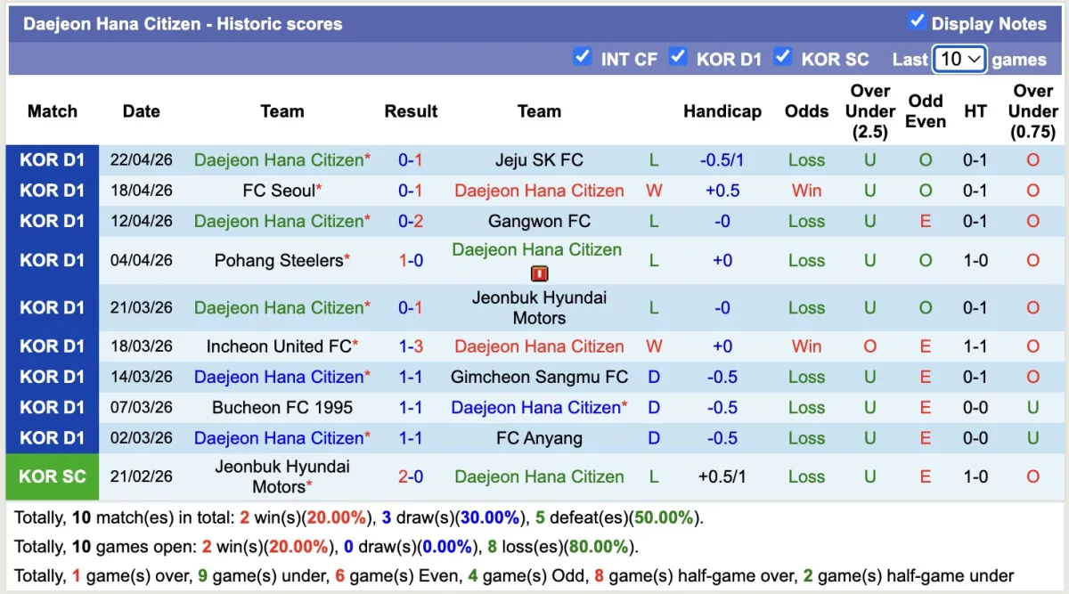 -Thống kê phong độ 10 trận đấu gần nhất của Daejeon Hana Citizen