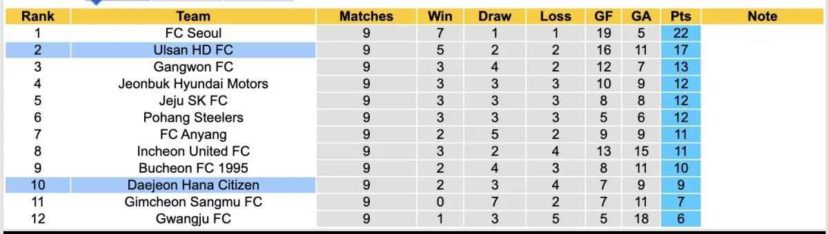 Daejeon Hana Citizen ở mùa giải năm ngoái đã làm lên lịch sử câu lạc bộ khi lần đầu tiên giành ngôi vị á quân K League 1. Nhưng niềm vui không quá dài khi mùa này họ đang chật vật. 9 vòng đấu đã qua đội khách chỉ sở hữu 9 điểm, đứng thứ 10.