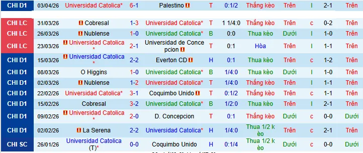 + Uni. Catolica đã vượt qua mức chấp +0.25 trong 9/10 trận sân nhà gần nhất của họ.
