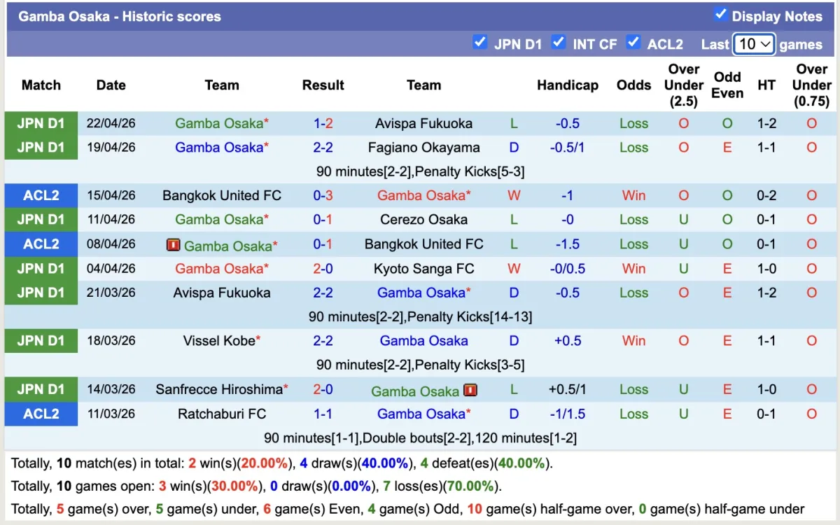 -Thống kê phong độ 10 trận đấu gần nhất của Gamba Osaka