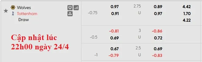 Tottenham là đội được đánh giá cao hơn ở trận này với kèo chấp lên tới 3/4, nhưng đó là mức chấp cũng không hoàn toàn đáng tin cậy với Gà trồng. Từ đầu mùa, họ thắng kèo có 14 trận, còn ít hơn 1 trận so với Wolves.