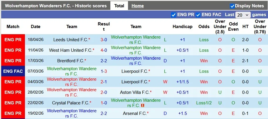 Thống kê phong độ 10 trận đấu gần nhất của Wolves