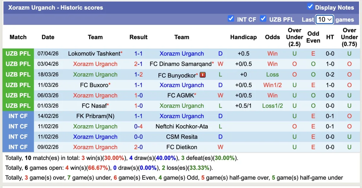 -Thống kê phong độ 10 trận đấu gần nhất của Xorazm Urganch
