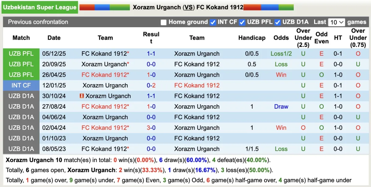 Ở lần đối đầu gần nhất Kokand 1912 được đánh giá cao hơn nhưng thua kèo. 4/5 vòng đấu gần đây Xorazm Urganch đều thắng kèo và 3/4 lần được chơi trên tổ ấm đội bóng này đều vượt ải Handicap, do đó có thể chủ nhà sẽ đáng tin với nhà đầu tư.