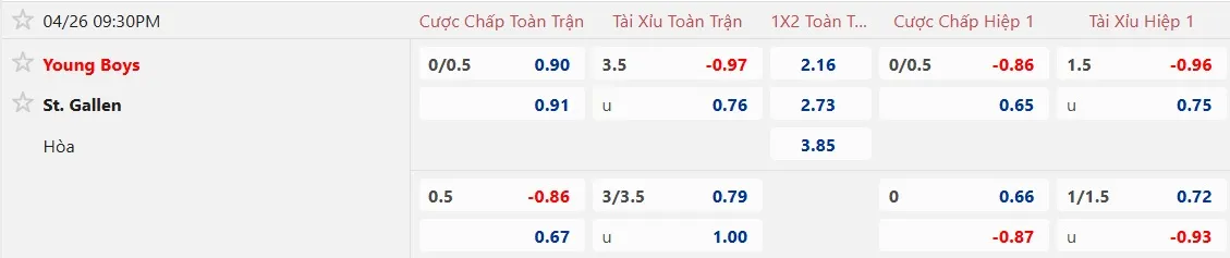 Chủ nhà Young Boys bước vào trận đấu này với thành tích không thắng kèo châu Á 4 trận liên tiếp gần đây, bao gồm 3 thất bại và 1 trận hòa. Với St. Gallen, các cầu thủ khách đang thắng kèo châu Á 3 trong 4 trận đấu vừa qua, thắng kèo 2/3 trận đối đầu gần nhất.