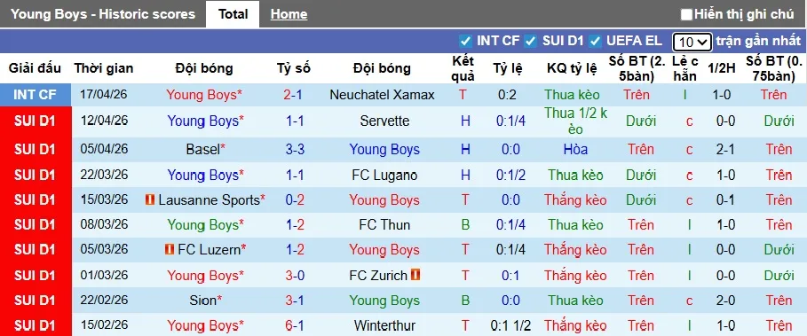 Thống kê phong độ 10 trận đấu gần nhất của Young Boys