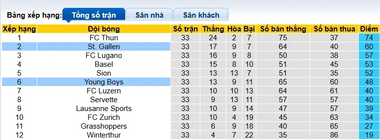 Thống kê phong độ, lịch sử đối đầu của Young Boys vs St. Gallen