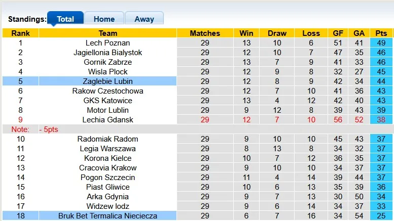 Vòng này, Zaglebie Lubin cũng chỉ phải tiếp đội chót bảng, Bruk Bet Termalica Nieciecza, đội gần như đã nắm chắc tấm vé xuống hạng khi kém nhóm an toàn đến 9 điểm khi giải chỉ còn 5 vòng nữa. Nieciecza thua 5/6 trận vừa qua, giành chỉ 1 điểm sau 6 trận sân khách liên tiếp.