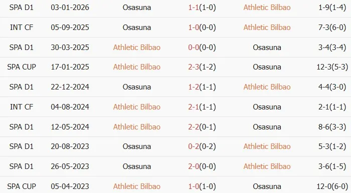 Thống kê phong độ, lịch sử đối đầu của Athletic Bilbao vs Osasuna