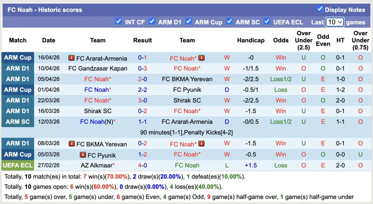 -Thống kê phong độ 10 trận đấu gần nhất của Noah