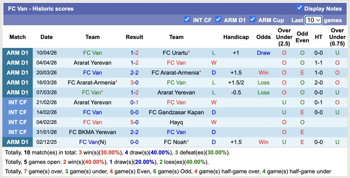 -Thống kê phong độ 10 trận đấu gần nhất của Van