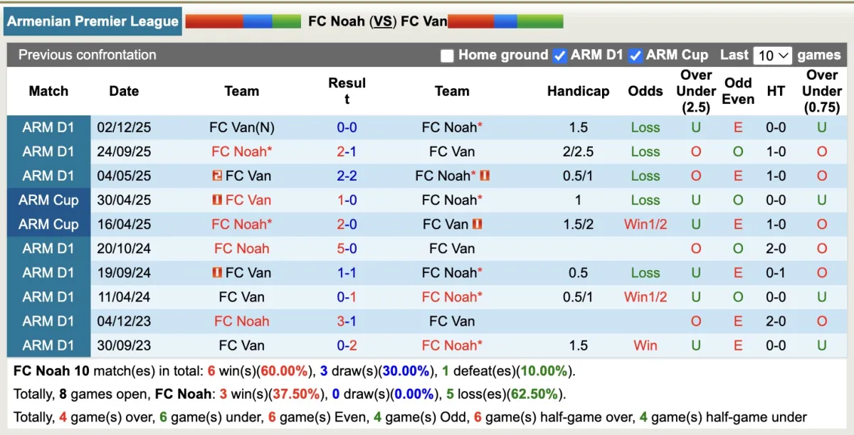Thống kê phong độ, lịch sử đối đầu của Noah với Van