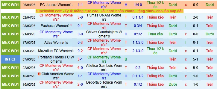 + Nữ Monterrey thắng 9 trong 10 trận gần nhất trên sân nhà theo kèo châu Á.
