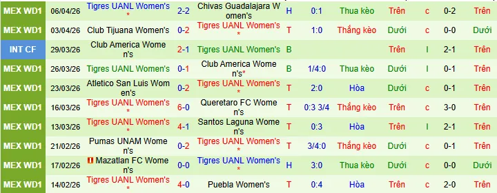 + Nữ Tigres UANL thắng 3 hòa 3 thua 4 trong 10 trận vừa qua theo kèo châu Á.