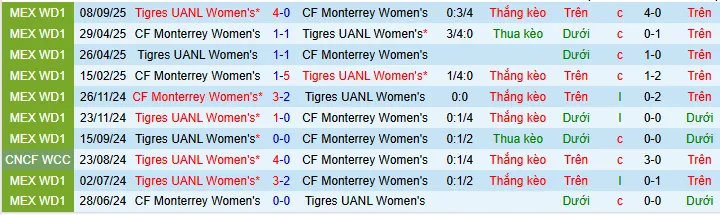 Thống kê phong độ, lịch sử đối đầu của Nữ Monterrey vs Nữ Tigres UANL