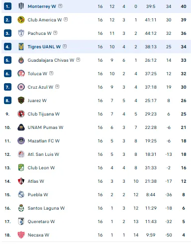 Nữ Tigres thì đang có 34 điểm, xếp thứ tư trên BXH, hơn đội thứ 9 đến 9 điểm nên đã chắc suất Top 8.