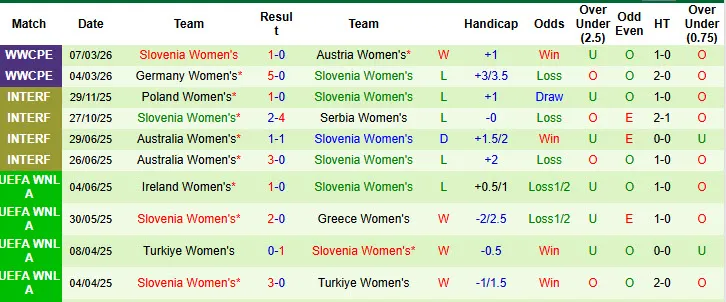 Thống kê phong độ 10 trận đấu gần nhất của Nữ Slovenia