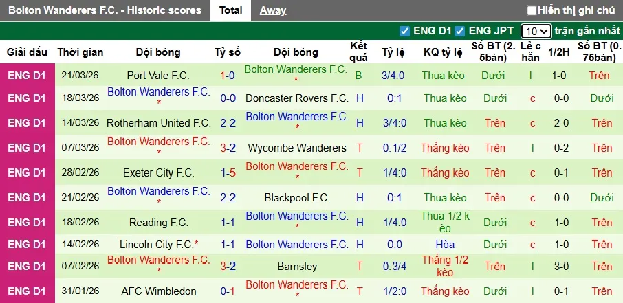 Thống kê phong độ 10 trận đấu gần nhất của Bolton
