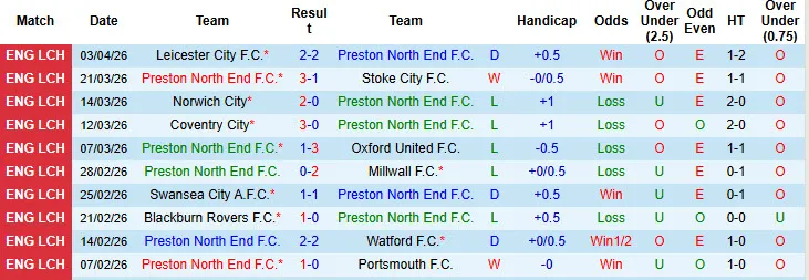 Thống kê phong độ 10 trận đấu gần nhất của Preston North End