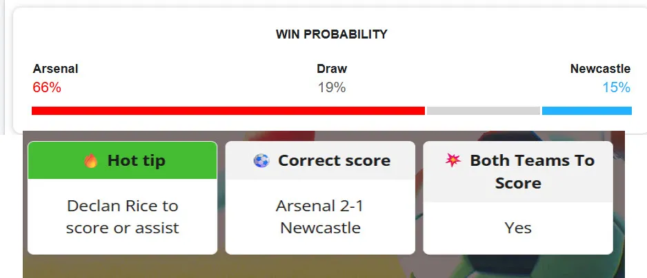 Ngoài ra, siêu máy tính cũng có những dự đoán đặc biệt của trận đấu. Trong đó, Arsenal với vị tỷ số 2-1 được máy tính kỳ vọng cao nhất. Ngoài ra, Declan Rice ghi bàn hoặc kiến tạo cũng được siêu máy tính đánh giá cao xảy ra. Tựu trung, đây là trận đấu hấp dẫn và kịch bản hai đội bóng cùng ghi bàn được máy tính kỳ vọng.