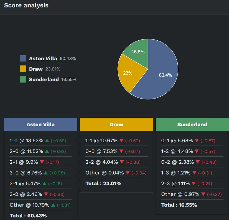 – Về tỷ số, trong trường hợp Aston Villa thắng thì tỷ số có khả năng xuất hiện cao nhất là 1-0 (khoảng 13,53%). Nếu hai đội chia điểm, tỷ số có khả năng xuất hiện cao nhất là 1-1 (khoảng 10,67%). Trong trường hợp Sunderland ca khúc khải hoàn, tỷ số có khả năng xuất hiện cao nhất là 0-1 (khoảng 5,68%).