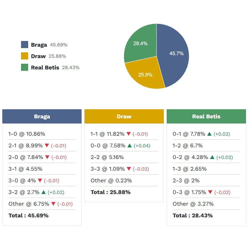Tỷ số khả dĩ nhất để Braga thắng là 1-0 với xác suất 10,86%. Các tỷ số có khả năng xảy ra tiếp theo là 2-1 (8,99%) và 2-0 (7,84%). Chiến thắng có khả năng xảy ra nhất của Real Betis là 1-0 (7,78%), trong khi tỷ số hòa là 1-1 (11,82%) – cũng là tỷ lệ dự đoán cao nhất trong các nhóm tỷ số.