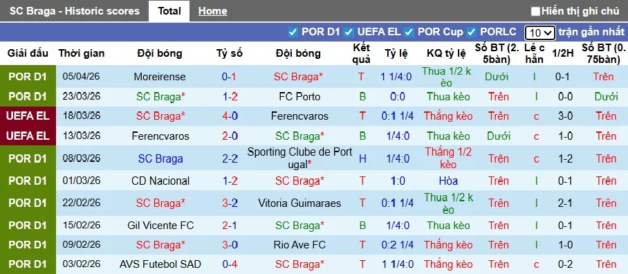 Thống kê phong độ 10 trận đấu gần nhất của Braga