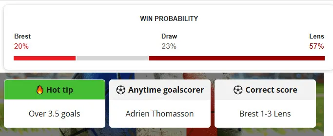 Đêm nay, Lens là đội bóng được siêu máy tính đánh giá cao khả năng giành thắng lợi khi đưa ra tỷ lệ chiến thắng lên tới 57%. Trong khi đó, tỷ lệ chiến thắng của Brest chỉ là 20%. Còn lại, tỷ lệ Brest vs Lens kết thúc với tỷ số hòa được máy tính dự đoán với tỷ lệ 23%. Ở một số dự đoán đặc biệt, máy tính đánh giá cao Lens sẽ thắng với tỷ số chính xác 3-1 và trong đó, tiền vệ Adrien Thomasson của đội khách khả năng cao sẽ nổ súng.