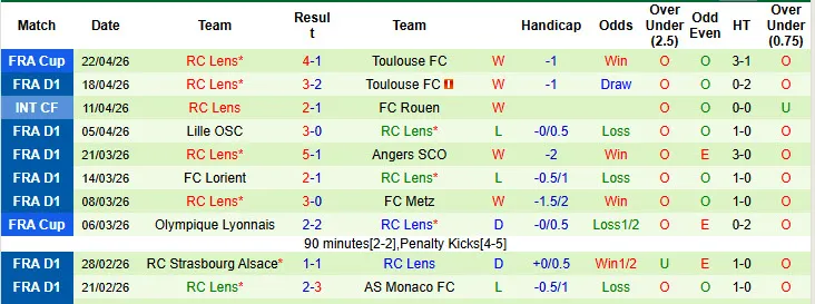 Thống kê phong độ 10 trận đấu gần nhất của Lens