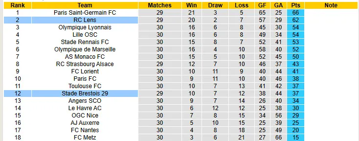 Được biết, họ tạm thời đứng ở vị trí thứ 2 với 62 điểm và tạm thời kém PSG khoảng cách 4 điểm. Trong bối cảnh cả hai còn 5 lượt trận nữa mới kết thúc mùa giải và đặc biệt còn một trận đối đầu trực tiếp trên sân của Lens, cơ hội vô địch giải VĐQG Pháp đang được chia đều cho cả PSG lẫn Lens.