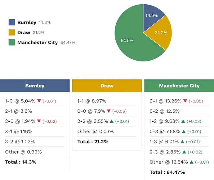 Tỷ số có khả năng xảy ra nhất để Manchester City thắng là 0-1 với xác suất 13,26%. Các tỷ số có khả năng xảy ra tiếp theo là 0-2 (12,5%) và 1-2 (9,63%). Tỷ số hòa có khả năng xảy ra nhất là 1-1 (8,97%), trong khi tỷ số thắng của Burnley là 1-0 (5,04%).