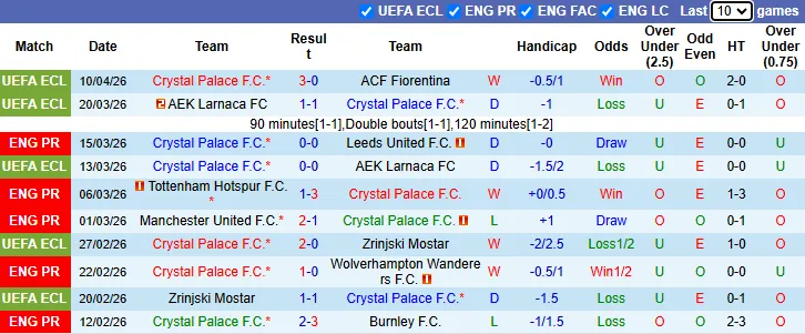 Thống kê phong độ 10 trận gần nhất của Crystal Palace