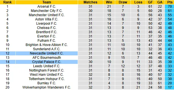 Thống kê phong độ, lịch sử đối đầu Crystal Palace vs Newcastle