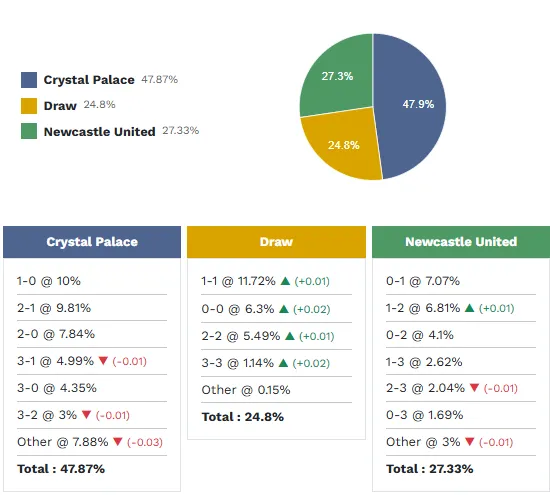 Theo phân tích về phong độ thi đấu cũng như số liệu thống kê của từng cầu thủ, kết quả có khả năng xảy ra nhất ở trận đấu này là Crystal Palace thắng với xác suất 47.9%. Một chiến thắng dành cho Newcastle có xác suất là 27.3% và một trận hòa có khả năng xảy ra là 24.8%.