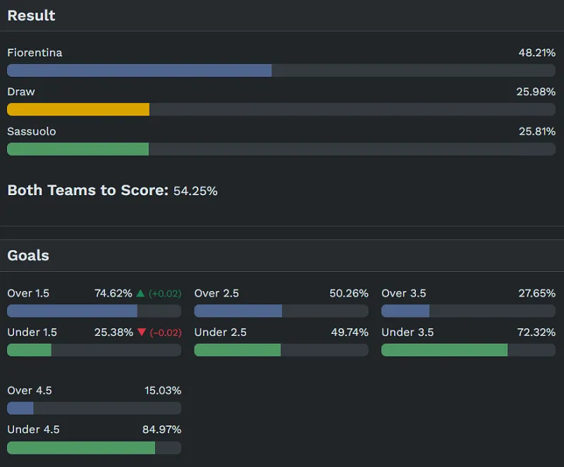 – Về tổng số bàn thắng, siêu máy tính của Sports Mole dành nhiều niềm tin hơn đôi chút cho khả năng bảng tỷ số thay đổi từ 3 lần trở lên. Khả năng trận Fiorentina vs Sassuolo xuất hiện từ 3 bàn trở lên vào khoảng 50,26% còn khả năng xuất hiện từ 2 bàn trở xuống vào khoảng 49,74%.