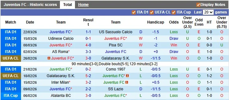 Thống kê phong độ 10 trận đấu gần nhất của Juventus