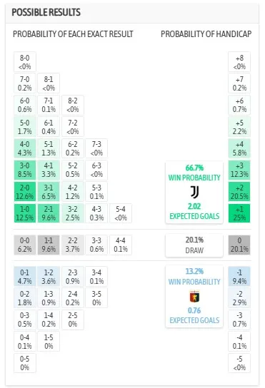 Trong nhóm tỷ số có thể thắng của Juventus, 2-0 và 1-0 có xác suất cao nhất với 12.6% và 12.5%. Sau đó đến 2-1 với 9.6% và 3-0 với 8.5%. Còn cao nhất để Genoa thắng là 1-0 với 4.7%.