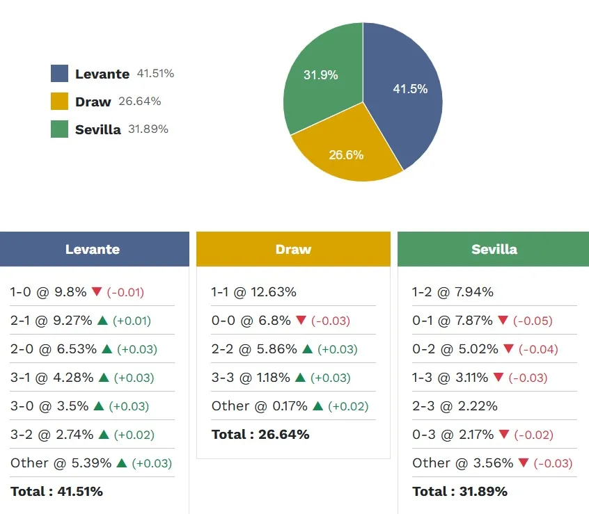Tỷ số khả dĩ nhất để Levante thắng là 1-0 với xác suất 9,8%. Các tỷ số có khả năng xảy ra tiếp theo là 2-1 (9,27%) và 2-0 (6,53%). Chiến thắng có khả năng xảy ra nhất của Sevilla là 2-1 (7,94%), trong khi tỷ số hòa là 1-1 (12,63%) – cũng là tỷ lệ dự đoán cao nhất trong các nhóm tỷ số.