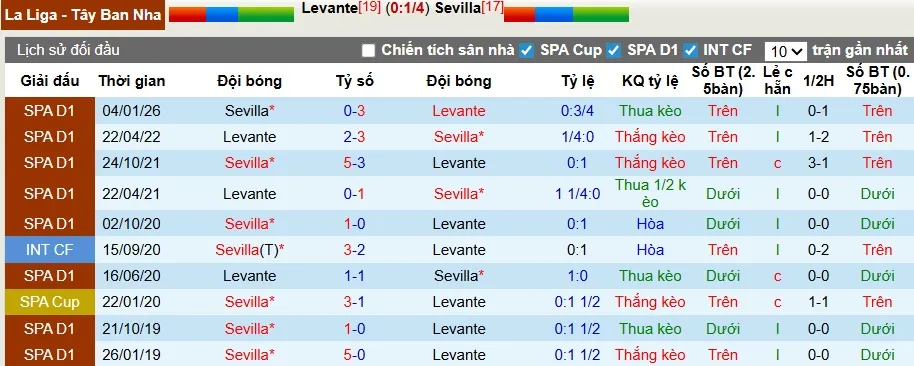 Thống kê phong độ, lịch sử đối đầu của Levante vs Sevilla