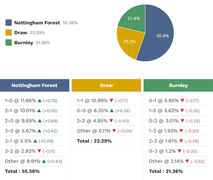 Tỷ số có khả năng xảy ra nhất cho chiến thắng của Nottingham Forest là 1-0 với xác suất 11,66%. Các tỷ số có khả năng xảy ra tiếp theo là 2-1 (10,01%) và 2-0 (9,69%). Tỷ số hòa có khả năng xảy ra nhất là 1-1 (10,99%), trong khi tỷ số cho chiến thắng của Burnley là 0-1 (5,85%).