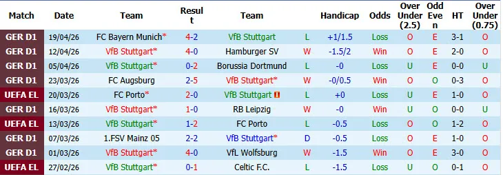 Thống kê phong độ 10 trận đấu gần nhất của Stuttgart