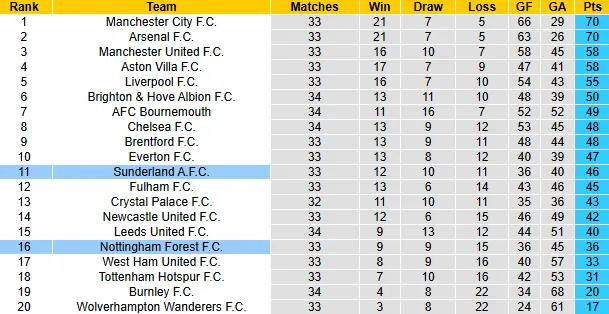 Rạng sáng ngày 25/4, sân The Light sẽ là tâm điểm của cuộc đối đầu giữa Sunderland và Nottingham Forest trong khuôn khổ vòng 34 Premier League 2025/26. Khi giải đấu chỉ còn 5 vòng nữa là hạ màn, cả hai đội đều đang bước vào giai đoạn nước rút với những tham vọng của riêng mình.